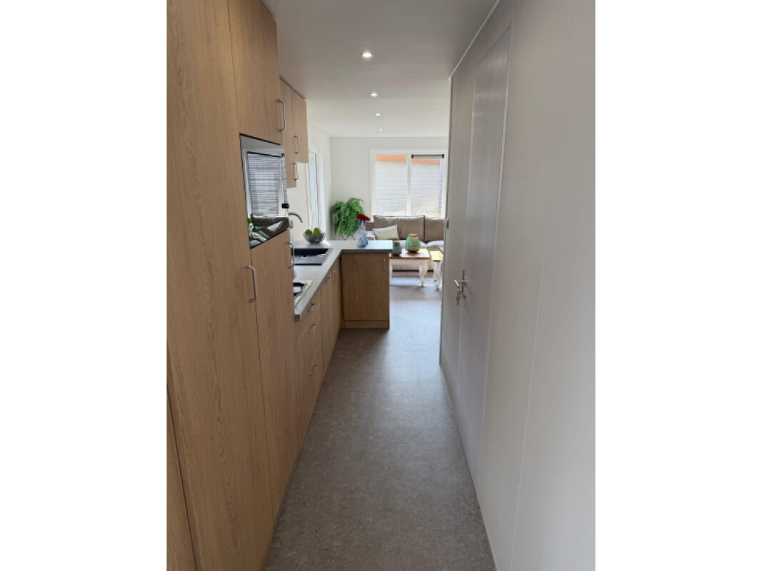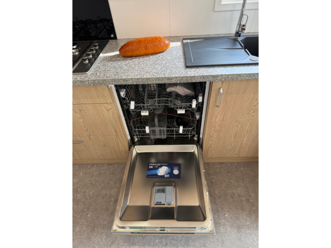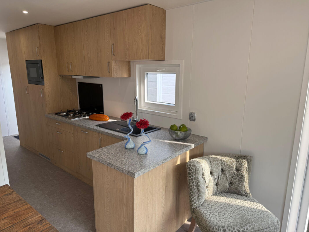 - Complete L-keuken met onder andere een vaatwasser, combimagnetron, kookplaat, spoelbak, afzuigkap en grote koelkast met vriesvak.