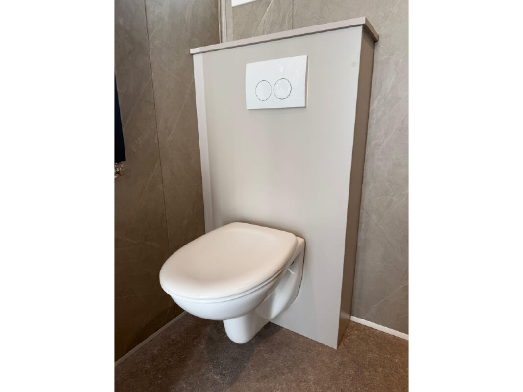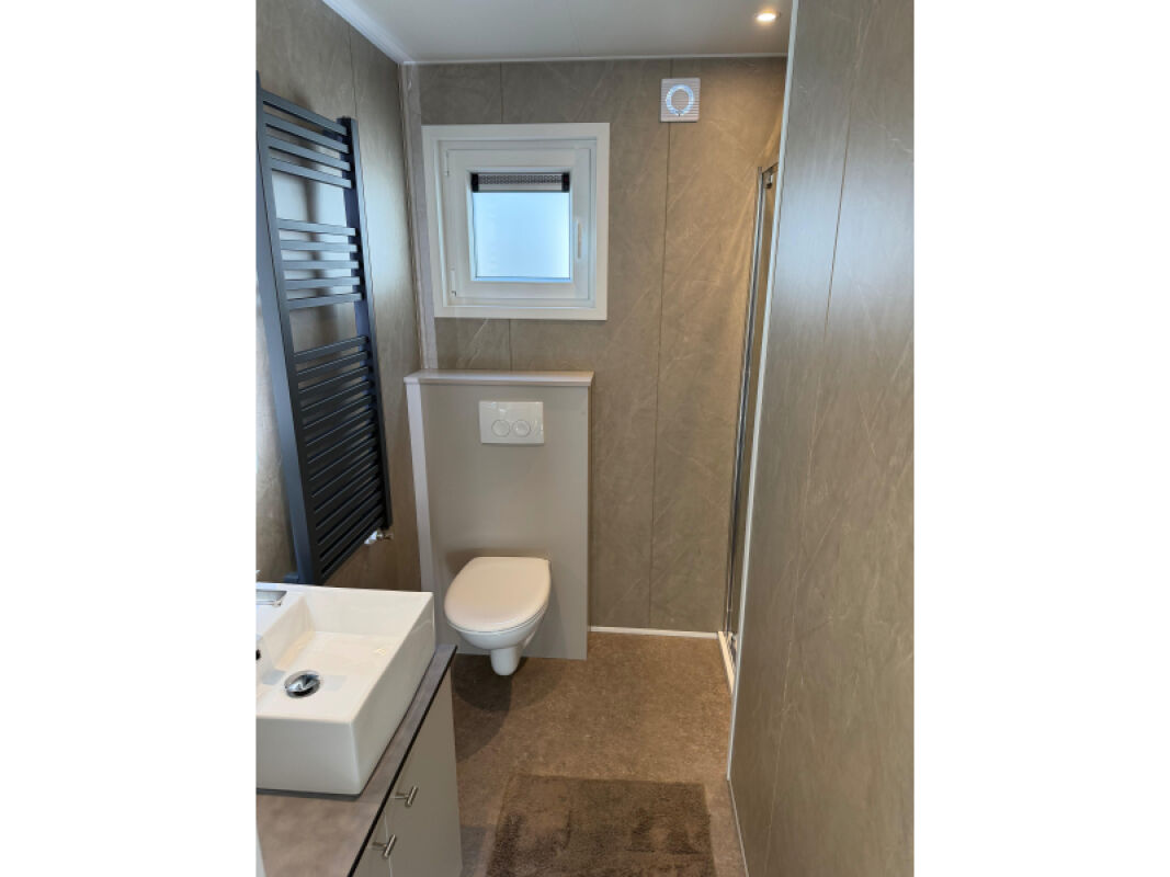 - Complete badkamer met onder andere kunststof wandpanelen, hangtoilet met plateau, luxe badmeubel en ruime douche.
