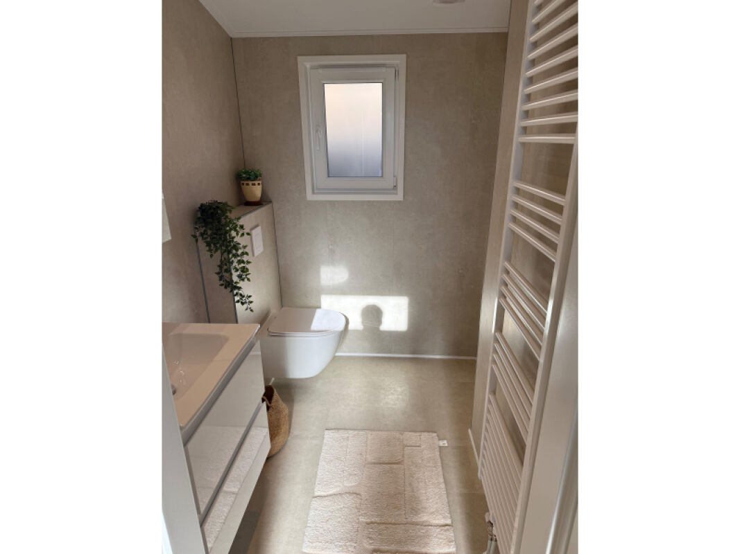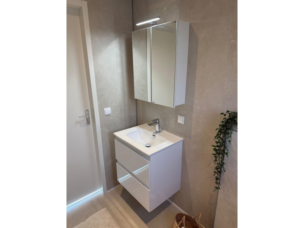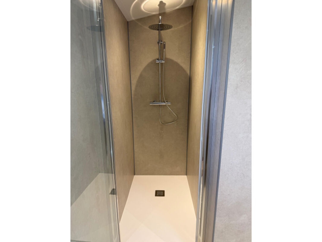 - Complete badkamer met onder andere kunststof wandpanelen, tegelvloer, douche van 1.20 x 0.80 met regendouche, hangtoilet met plateau en luxe badmeubel.