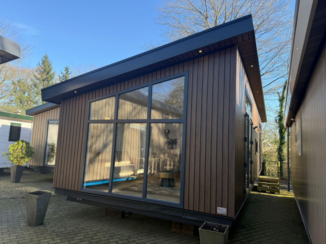 - Kunststof buitenbekleding met houtlook, verticaal gemonteerd.