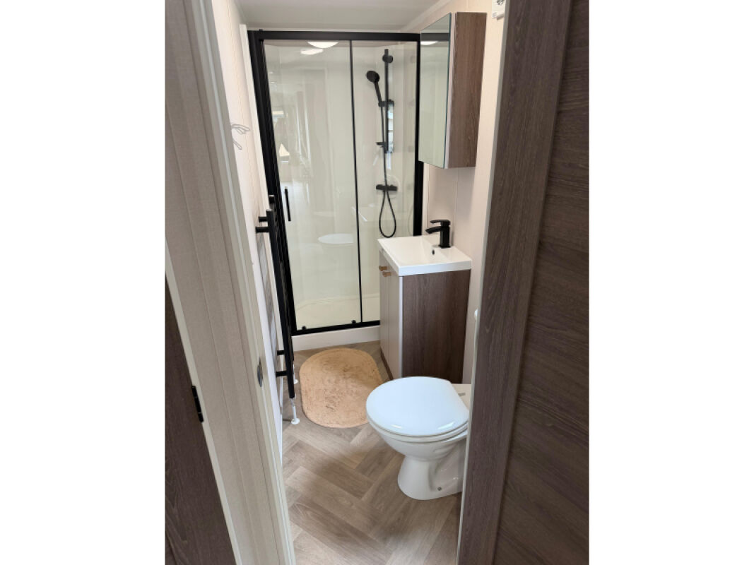 - Complete badkamer met onder andere een douche, luxe badmeubel, toilet en chique zwarte details.