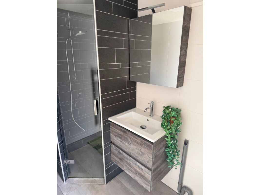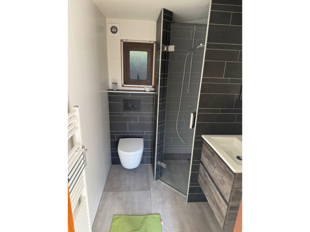 - Complete gerenoveerde, betegelde badkamer met onder andere een inloopdouche, hangtoilet, luxe badmeubel en wasmachineaansluiting.