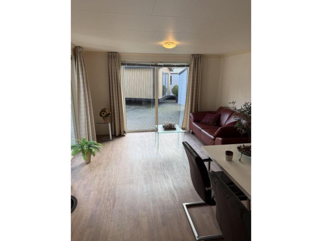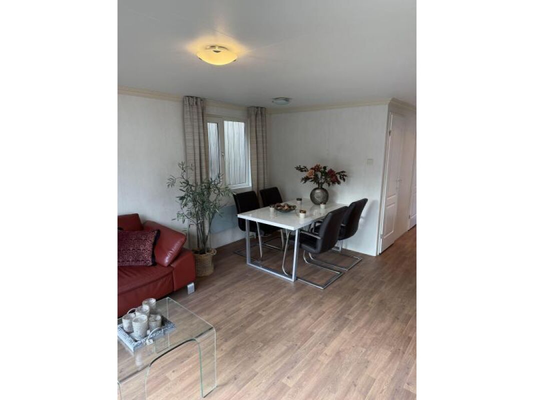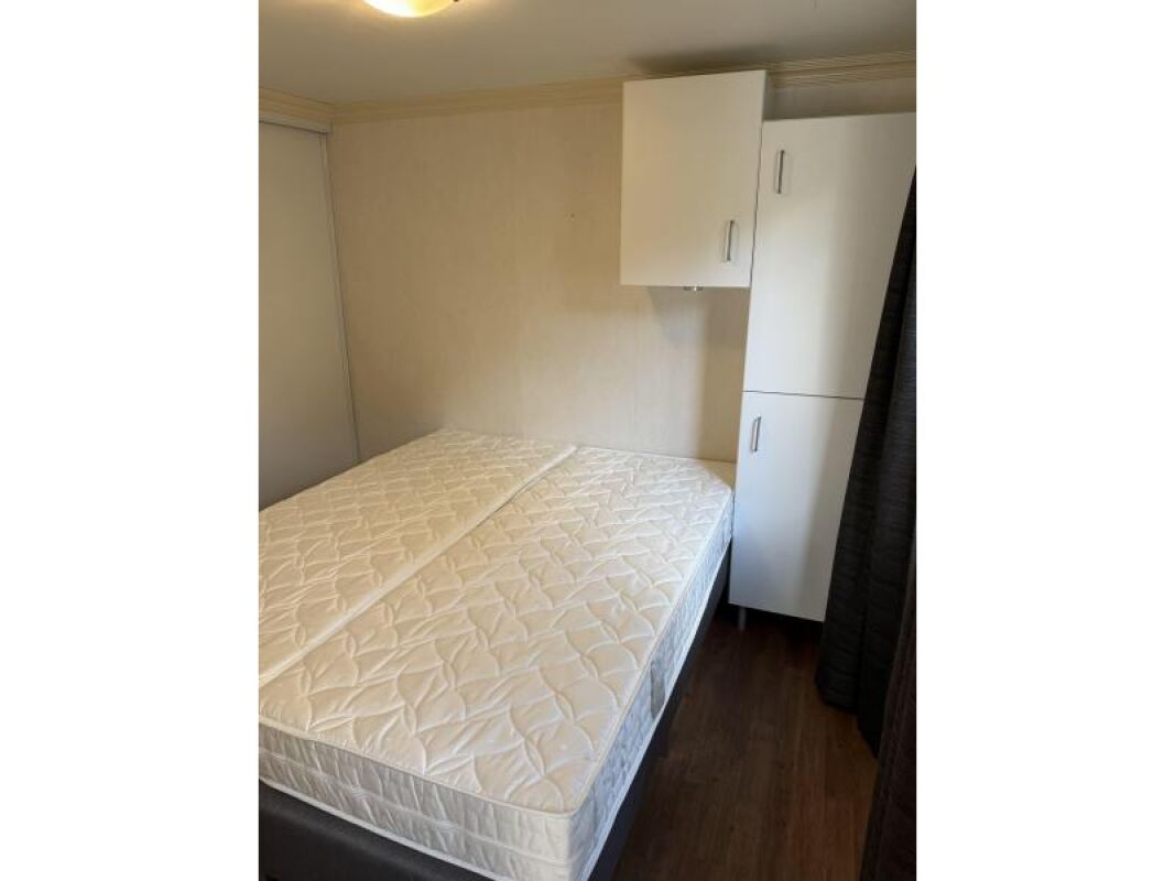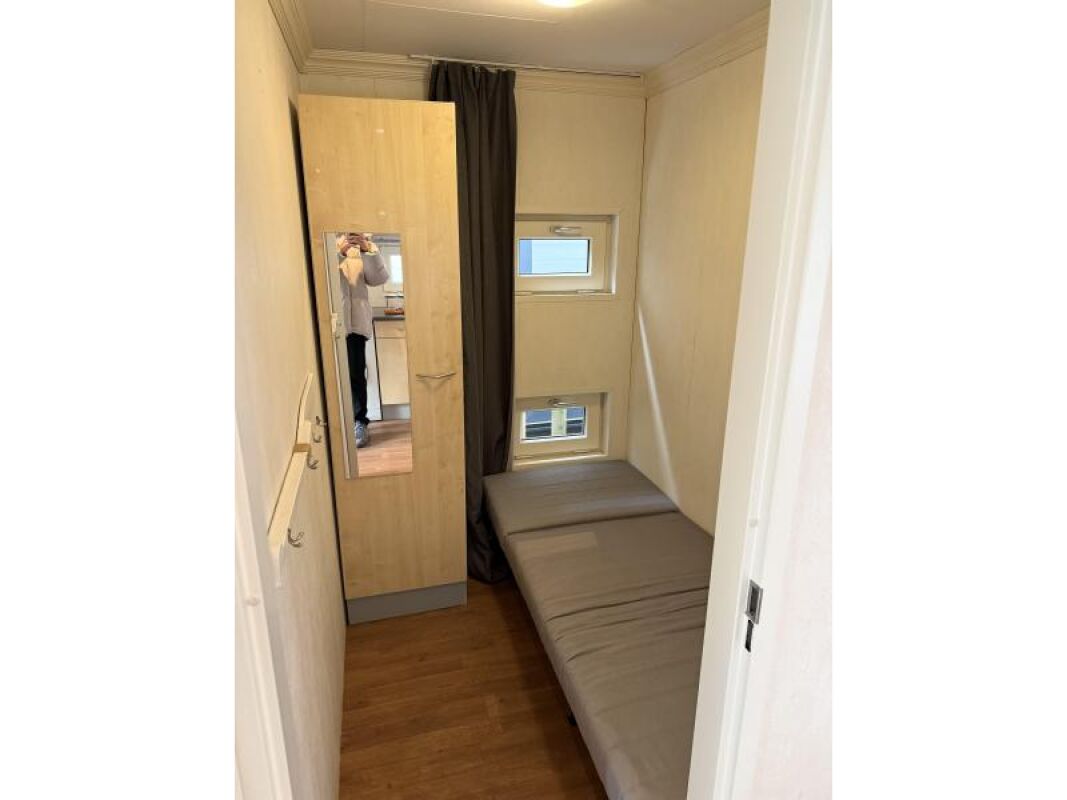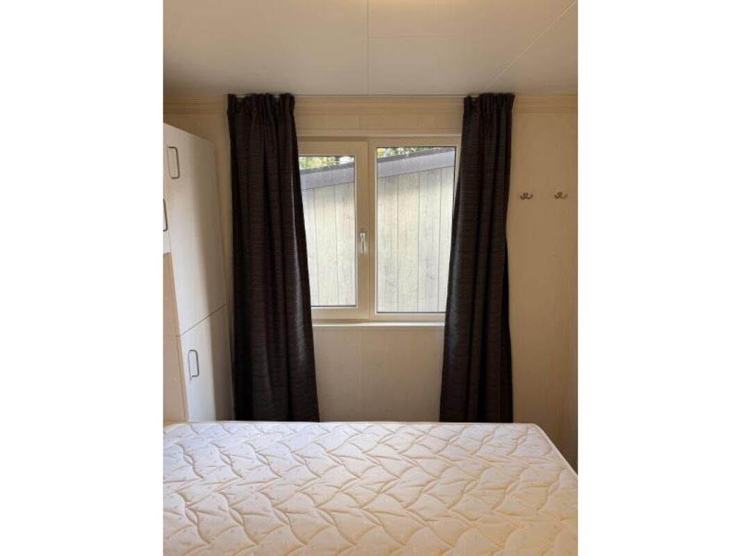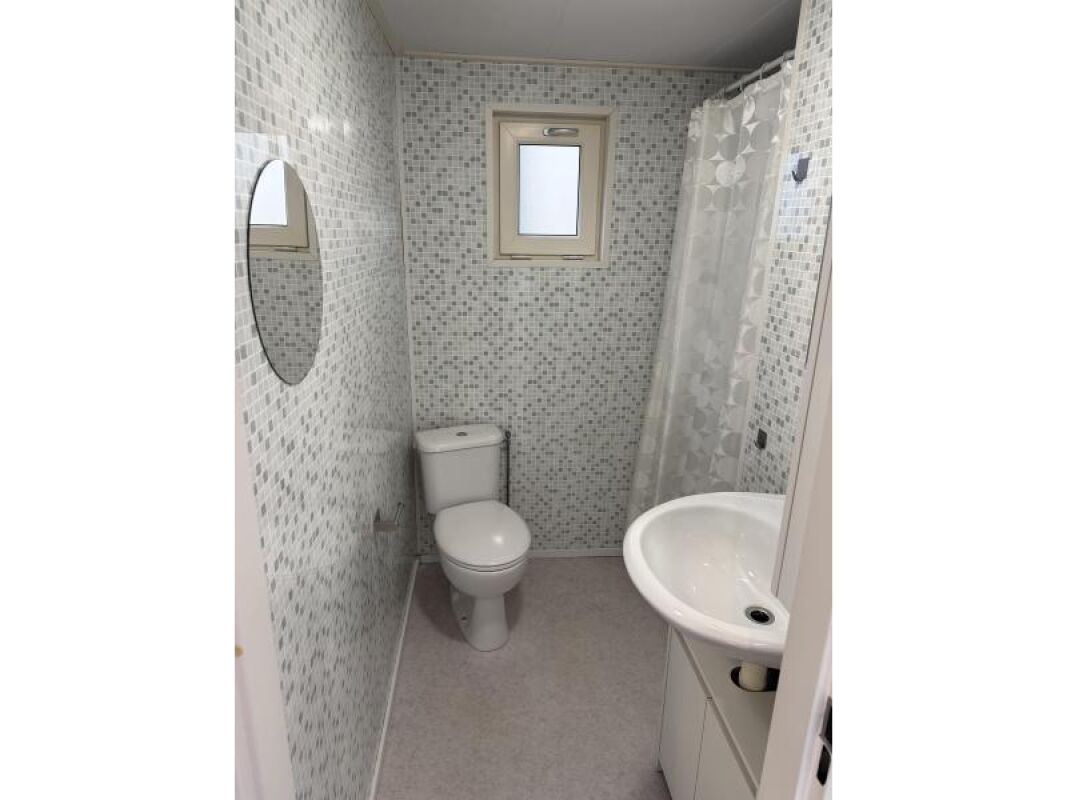 Kunststof chalet van 10 x 4 met een erg royale badkamer en hoofdslaapkamer.