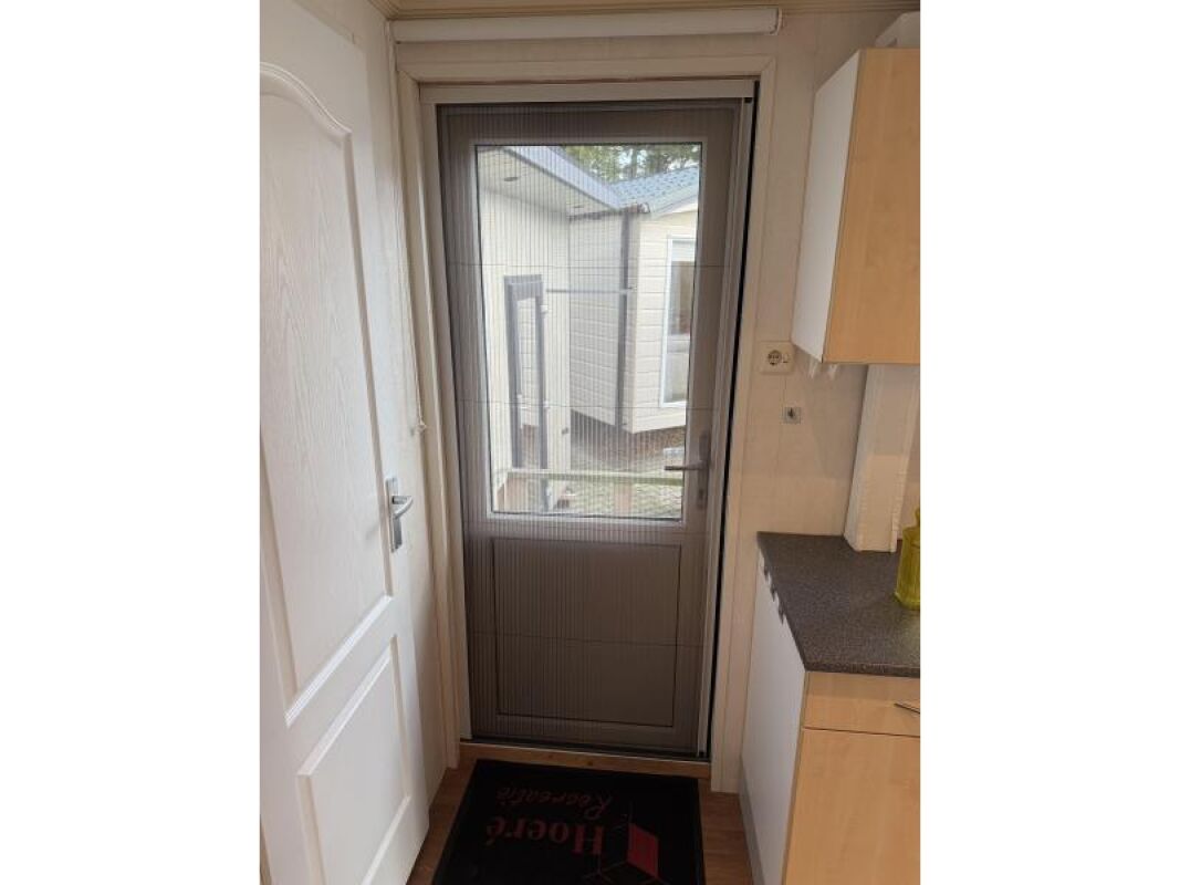 - Plissédeur en rolgordijn bij de voordeur.