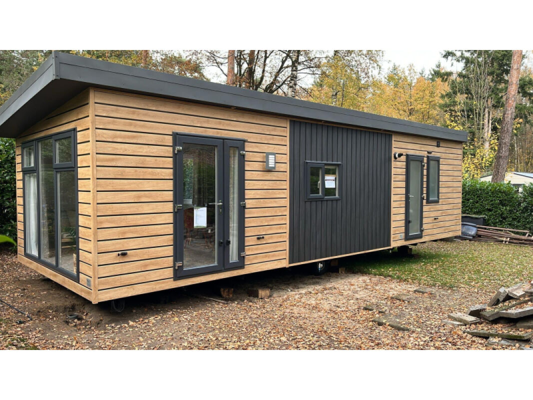 - Kunststof buitenbekleding in houtlook, 2 types gecombineerd.